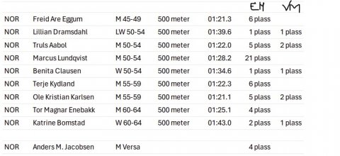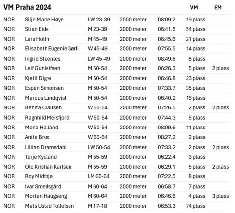 Blant de 11 deltakerne på herresiden har vi Kent Pettersson (59 år) som tok gull i sin klasse i Paris 2020. Han har deltatt i de aller fleste offisielle og uoffisielle VM de siste 30 åra. Også han deltok i Åpen klasse i NM, der han ble nr 17 i konkurranse, med deltakere han nesten kunne vært bestefar til! Han er i sitt siste år i aldersklassen 55-59, så neste års mesterskap blir vel det store målet med overgang til ny aldersklasse. Han skal ro 2000m og stafett i årets VM. Det samme skal Ole Kristian Karlsen (59 år), som i tillegg også skal ro 500m. Han har sølv på 2000m og gull i sin klasse på 500m fra Paris 2020 og henholdsvis bronse og gull i det hybride mesterskapet i 2021. Han er på en god dag blant de beste på begge distanser i Praha. Dirk Müller (57 år) er sprint-spesialist. Han skal ro stafett og selvfølgelig 500 meter, der han er medaljekandidat i sin klasse. De andre deltakerne deltar i 23-39, 40-49, 50-54, 55-59, 60-64 lettvekt og 75-79 lettvekt.